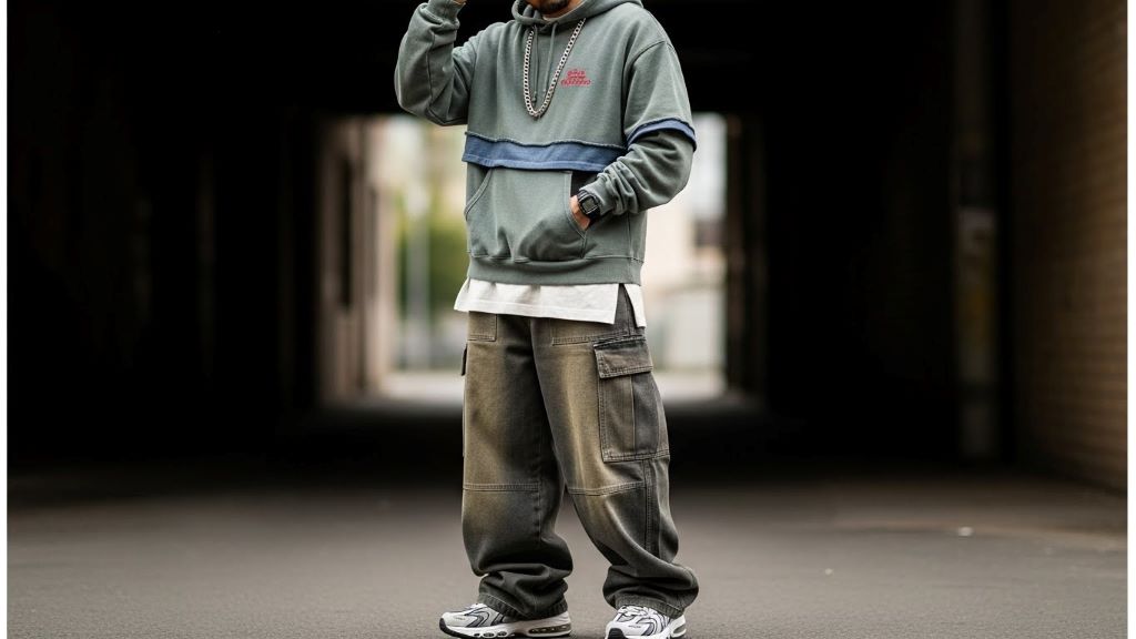 Y2K fashion refers to men’s clothing styles popular in the late 1990s and early 2000s. It features oversized silhouettes, baggy jeans, graphic tees, athletic wear, and bold accessories. The aesthetic emphasizes exaggerated proportions and casual, sporty vibes.